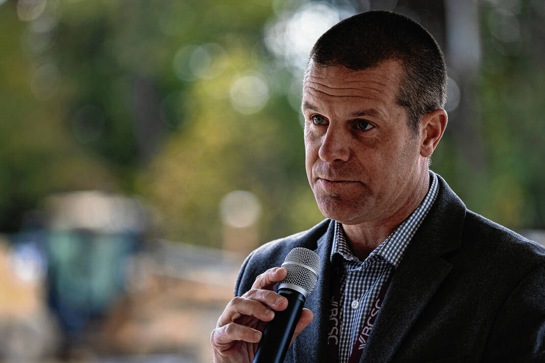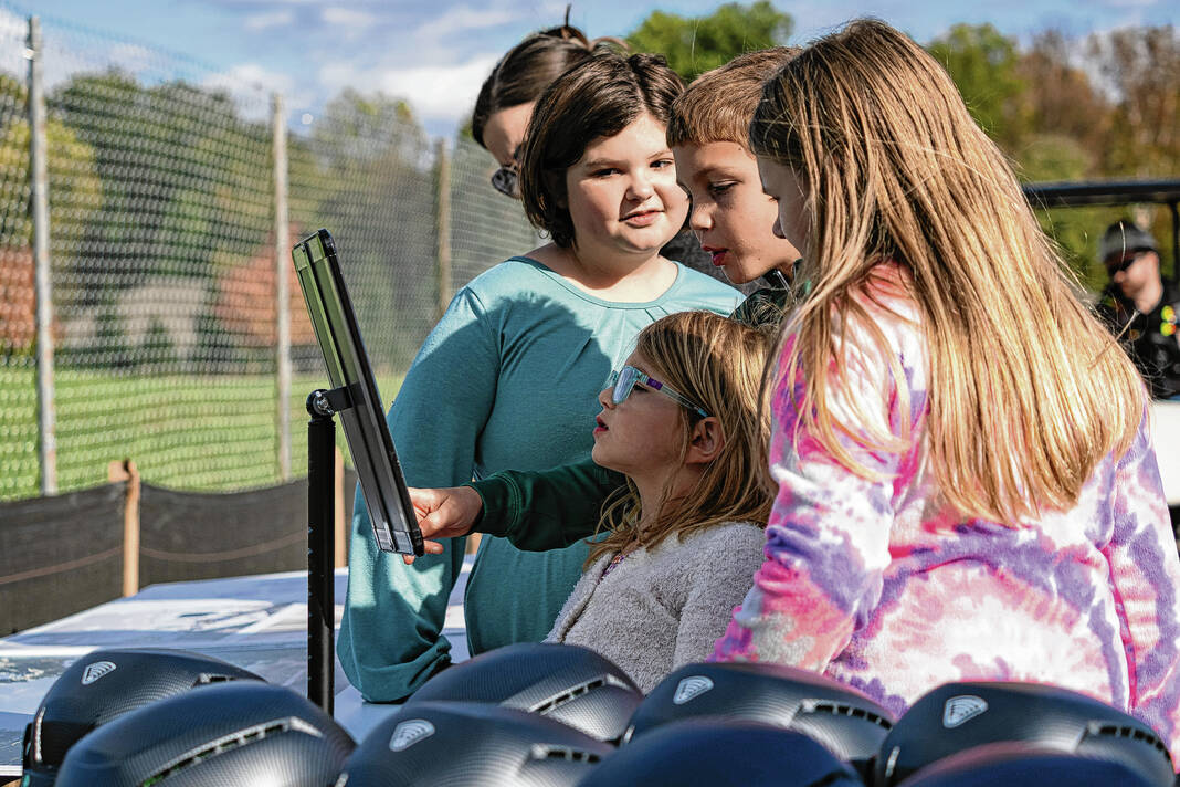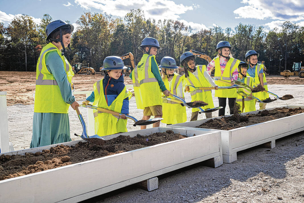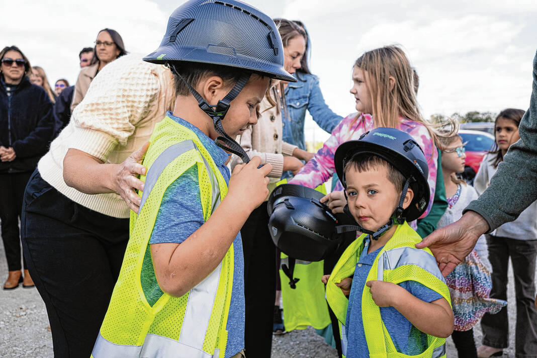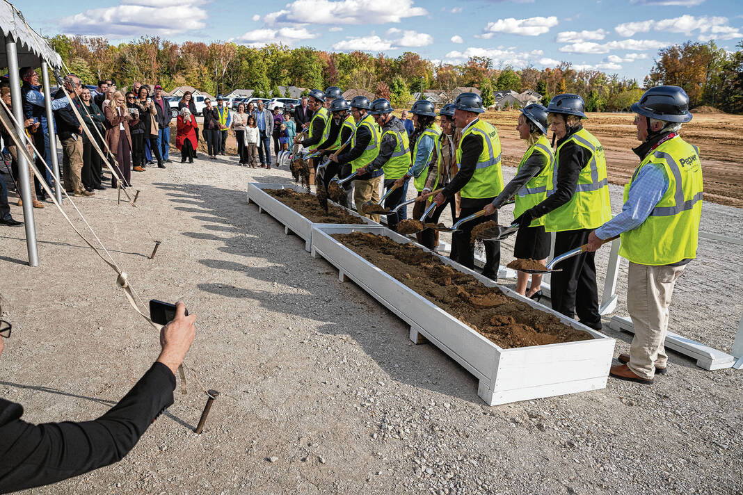Mike Wolanin | The Republic Evelyn Cherry, from left, Alvin Cherry, Scott Eickhoff, Claire Eickhoff, Anna Ryshavy, Avery Cherry, August Edgren and Henry Edgren turn shovels of dirt during a groundbreaking ceremony for Maple Grove Elementarty School, Wednesday, Oct. 22, 2025, in Columbus, Indiana.