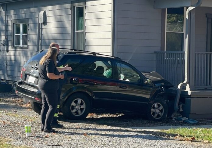 Witnesses said the accident happened at about 10:45 a.m. when a black Kia Sorrento driven by Daniel Lain-Sutherlin, 23, Columbus, was heading to Marr Road to get to the Engagement Center when he attempted to avoid a collision with a van and went off the road into the pole and porch.