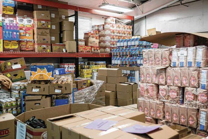 Mike Wolanin | The Republic Food is stacked on shelves and pallets at the Love Chapel food pantry in Columbus, Ind., Monday, Nov. 20, 2023.