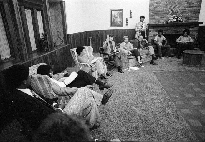 James Gillespie, center left, admissions director for the Columbus Center of IUPUI, discusses the college’s operation during a careers night on Oct. 29, 1975, at the Two Worlds Clubhouse, 2024 Beam Road.