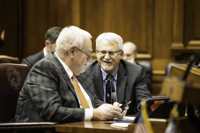 Indiana House Speaker Pro Tem Mike Karickhoff, right, speaks with House Majority Floor Leader Matt Lehman during the 2025 session. (Photo courtesy of House Republican Caucus)