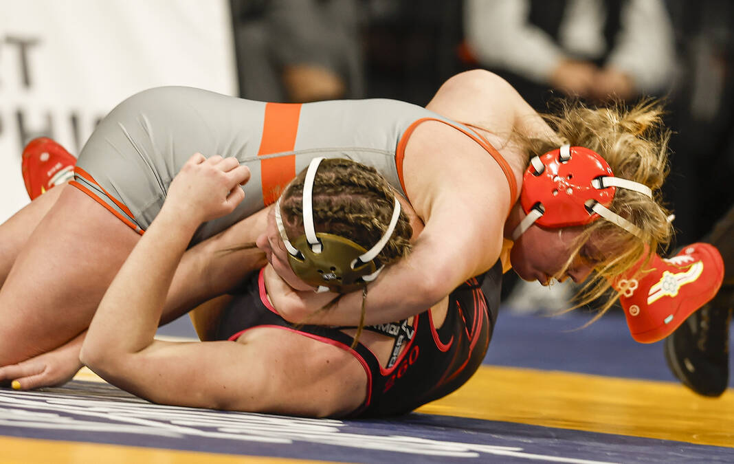 Columbus East’s Maddie Shrader, right, goes for the pin on Elkhart’s Lily Clark in the 235-pound first-round match Jan. 17 at the Girls Wrestling State Finals at the Corteva Coliseum in Indianapolis.