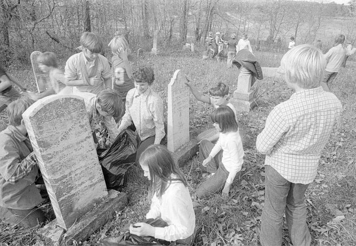 Fifth- and sixth-graders from Mt. Healthy Elementary School help teacher Linda Adams, center, clean up a cemetery near Grandview Lake on Nov. 6, 1975.