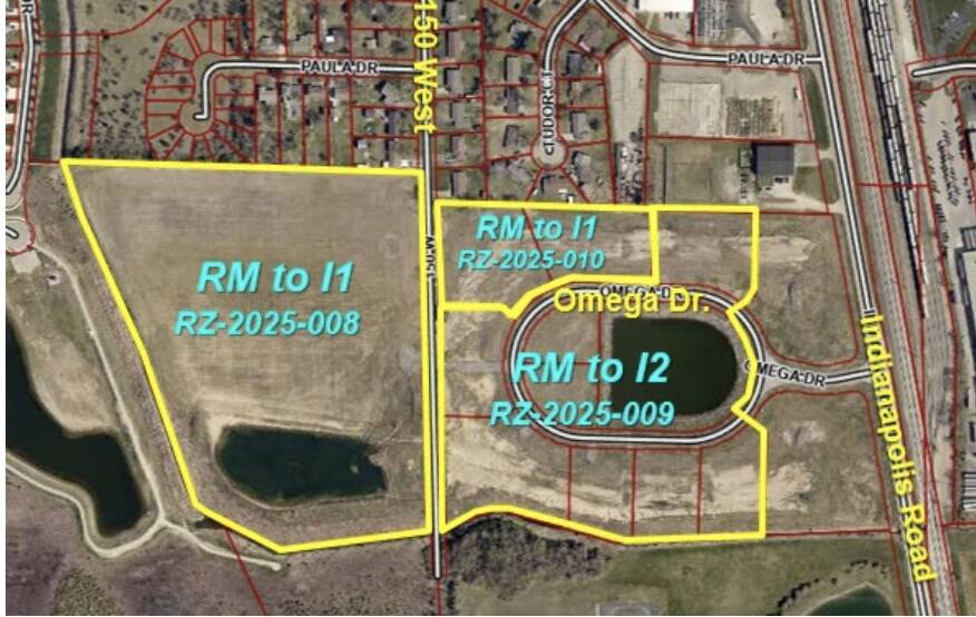 • Omega Drive: Eight lots and a storm water common area in the Drive-In Commercial Park (12.32 acres total) from Residential Multi-Family (RM) to Industrial: General with commitments (I2c)