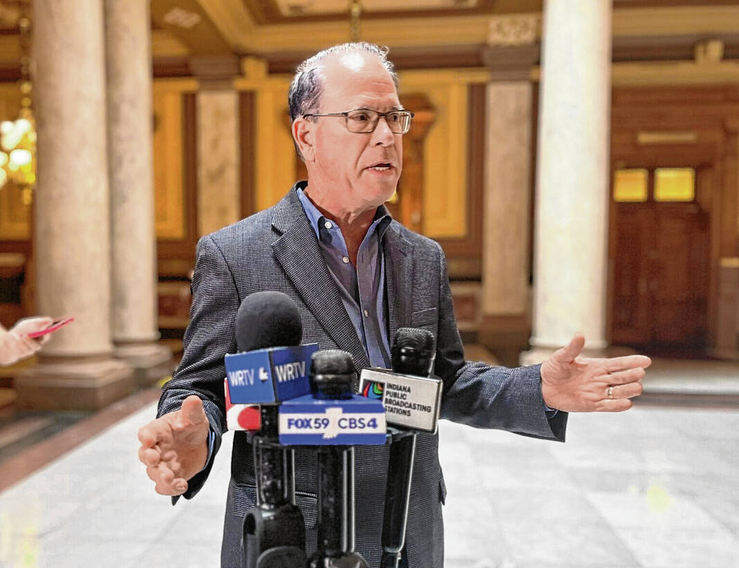 Niki Kelly/Indiana Capital Chronicle Gov. Mike Braun addresses reporters on Monday, Aug. 18, 2025, at the Indiana Statehouse.