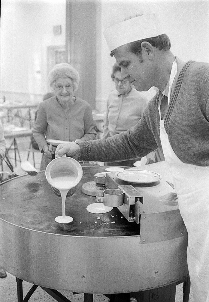 Barney Carr pours batter onto a hot griddle at the Kiwanis Pancake Feast at Donner Center on Nov. 14, 1975, while Clara Stern and Sadie Smith wait for them to bake a golden brown.