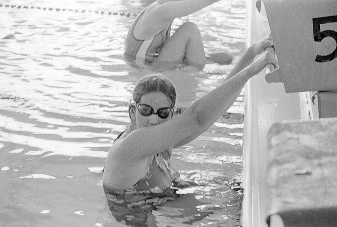 Jan Davis of Columbus East prepares for the start of the 200-yard backstroke relay while Columbus North team members cheer on their teammates in another event in the East Relays on Nov. 15, 1975.