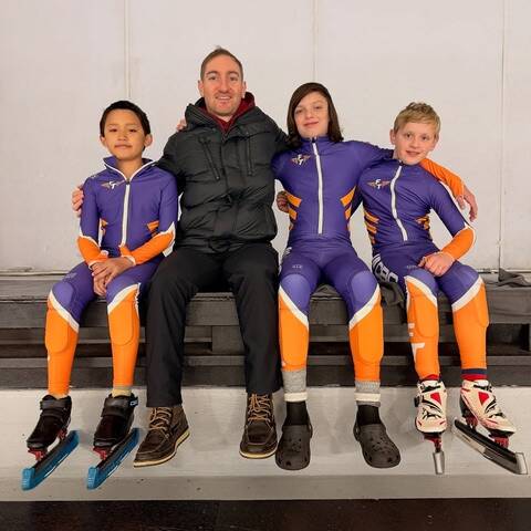 Full Throttle Speed Skating members Ethan Tan (left), Quin Fortner and Edward Meir are pictured with coach Mikey Burdekin at Franklin Park.
