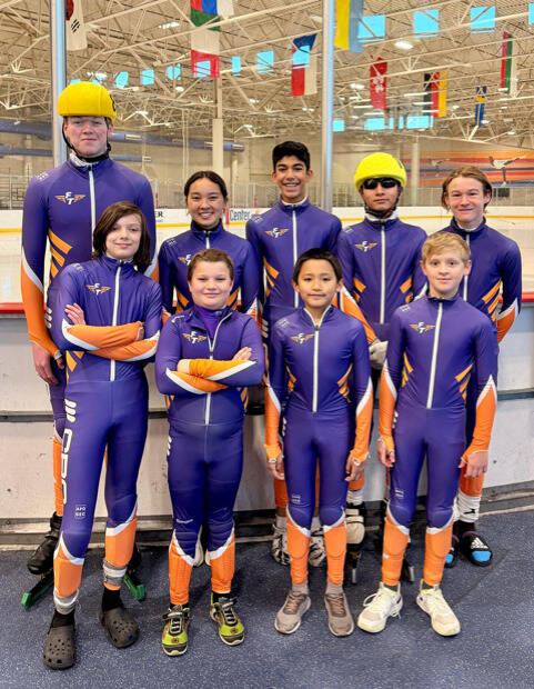 Full Throttle Speed Skating competed at the Petit National Ice Center. Pictured are, font row from left, Quin Fortner, Finn Phipps, Ethan Tan, Edward Meir; and back row, Wyatt Kiefer, Maria Marimoto Taqueushi, Vivaan Gupta, Luis Marimoto Taqueushi and Eric Nichols.