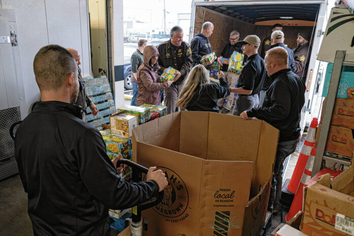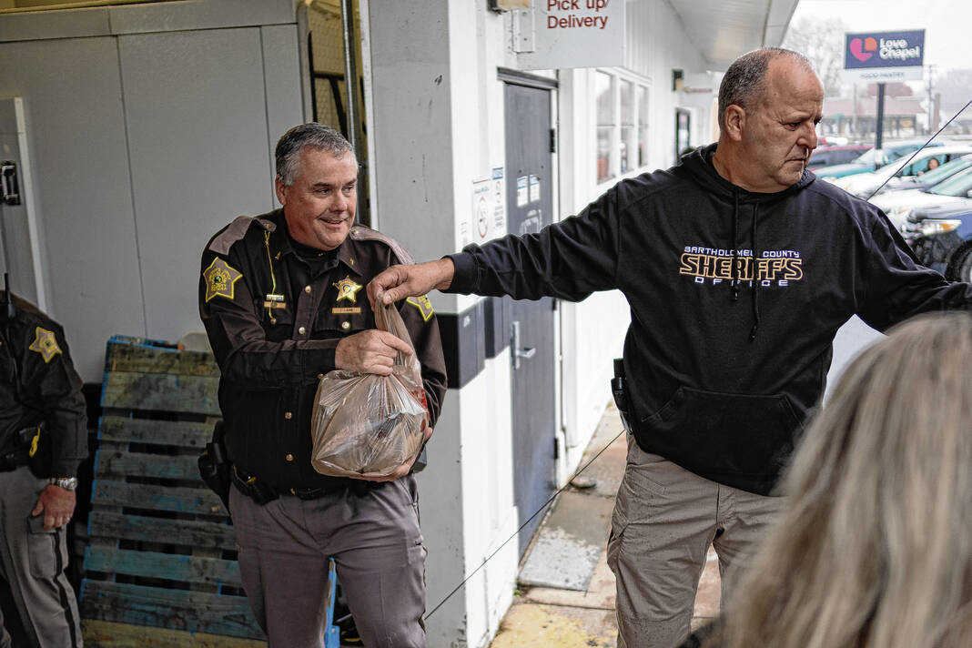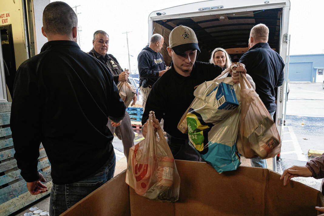Mike Wolanin | The Republic Members of the Bartholomew County Sheriff’s Office unload donations from their Pack-a-Patrol-Car food drive at the Love Chapel Food Pantry in Columbus, Ind., Friday, Nov. 21, 2025.