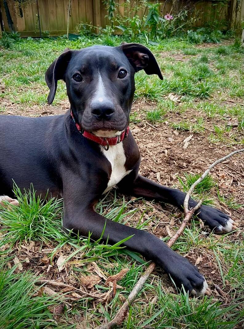Rosalina is now 99% housebroken. She loves exploring the neighborhood and just loves her walks and does so mostly on a loose leash (she does not pull). Rosalina responds to “come,” “go outside,” “sit” and “kennel.” When asked to “kennel,” she heads right in and waits quietly or sleeps until it’s time to come out. She also knows not to beg or expect attention during family meals. Rosalina’s favorite activities currently are play-wrestling with the older dogs in the foster home and chasing them around the yard, as well as chewing up tree branches (she has also learned not to chew furniture, shoes, etc.) and keeping a keen eye out for squirrels and cats outside in the yard. In other words, she’s worked through nearly all of the typical puppy issues and would be the perfect, adorable companion for someone to choose for their forever home!