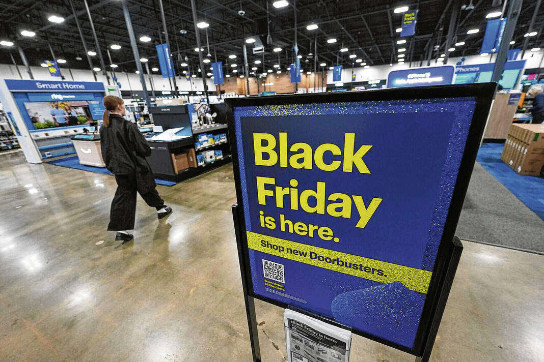 A sign promoting Black Friday deals stands in a Best Buy store in 2024 in south Denver, Colo.
