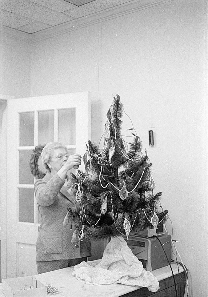 Loretta Reinking, secretary in the Bartholomew County Commissioners’ office, puts finishing touches upon the office’s Christmas tree on Dec. 2, 1975.