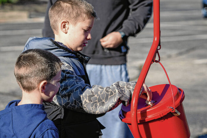 Mike Wolanin | The Republic Logan, left, and Brody Zollman donate during the Salvation Army’s kettle kick-off event at Hobby Lobby in Columbus, Ind., Saturday, Nov. 1, 2025.