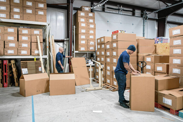 Mike Wolanin | The Republic Columbus firefighters Wes Thayer, left, Mitch Tuttle construct gift delivery boxes for the Columbus Firemen’s Cheer Fund at the Columbus Firemen’s Cheer Fund building in Columbus, Ind., Tuesday, Dec. 2, 2025.