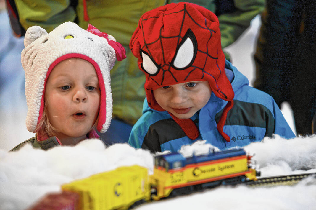 Maggie Novreske, left, and Gus Novreske, right, look for Santa Claus figurines on the front of a model train at the annual Festival of Lights Christmas Village inside The Commons in downtown Columbus on Dec. 5, 2015.