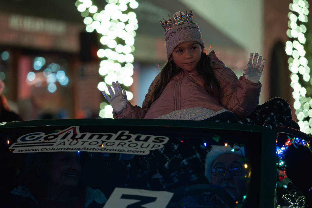 Mike Wolanin | The Republic Parade Marshall Maeve Watts waves at spectators from the back of a car being driven by Fred Armstrong during the annual Festival of Lights Parade in Columbus, Ind., Saturday, Dec. 6, 2025.