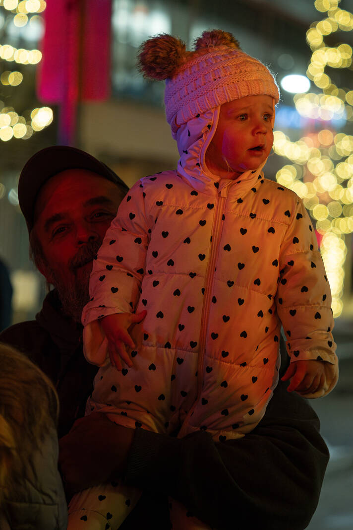 Mike Wolanin | The Republic Steve Mettert holds his granddaughter Aubrey Mettert so she can get a better view of the annual Festival of Lights Parade in Columbus, Ind., Saturday, Dec. 6, 2025.