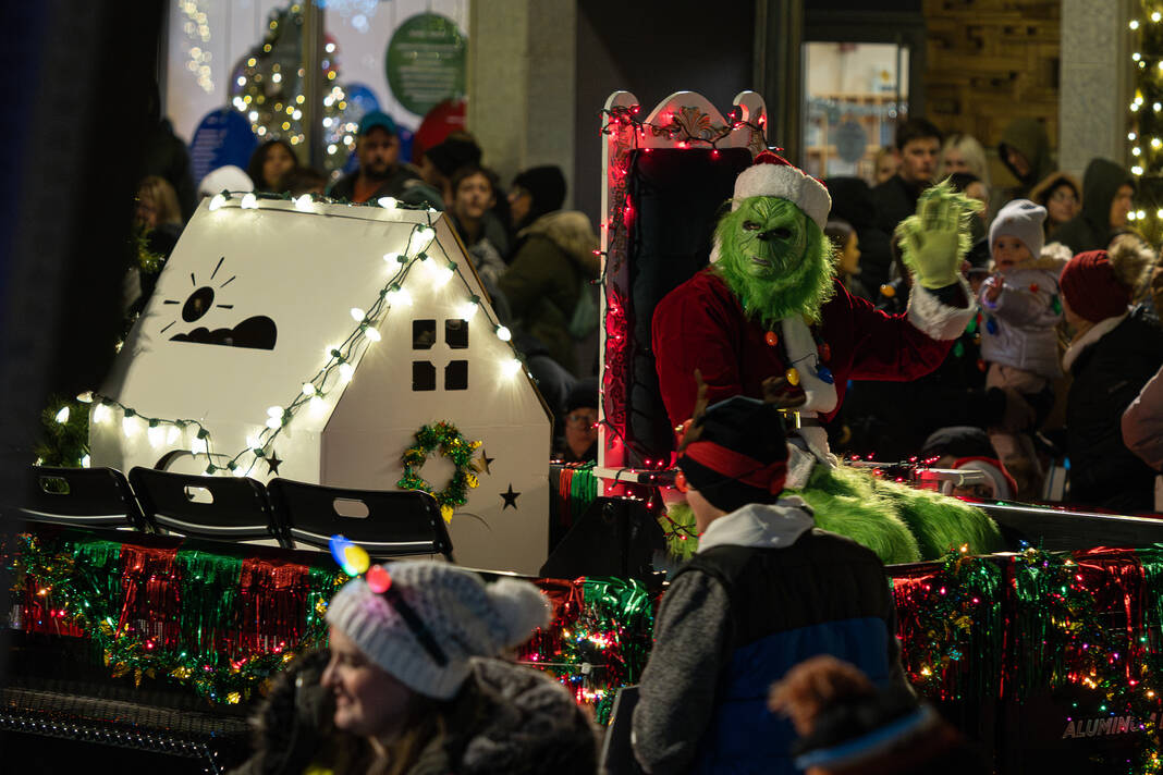 Mike Wolanin | The Republic A person in a Grinch costume waves to spectators during the annual Festival of Lights Parade in Columbus, Ind., Saturday, Dec. 6, 2025.