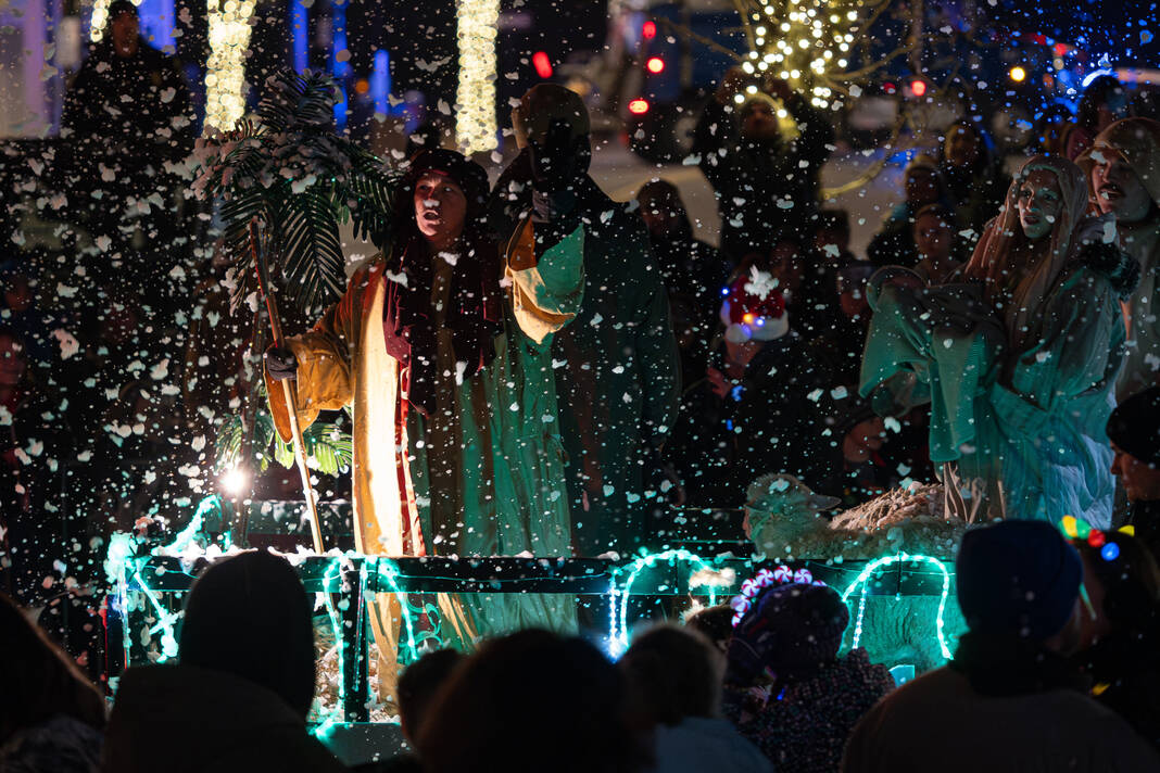 Mike Wolanin | The Republic Fake snow falls on spectators during the annual Festival of Lights Parade in Columbus, Ind., Saturday, Dec. 6, 2025.