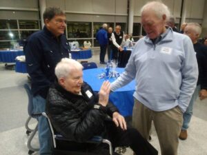 Former Columbus North boys gymnastics coach John Hinds, center, is greeted by former gymnast Jim Kahlenbeck, left, and assistant coach Louie Russell at a reception Nov. 29 in the school cafeteria.