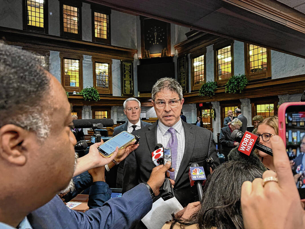 Photo by Casey Smith/Indiana Capital Chronicle Indiana Republican Senate Pro Tem Rodric Bray addresses reporters after the chamber rejected a contentious mid-decade redistricting proposal on Thursday, Dec. 11, 2025.
