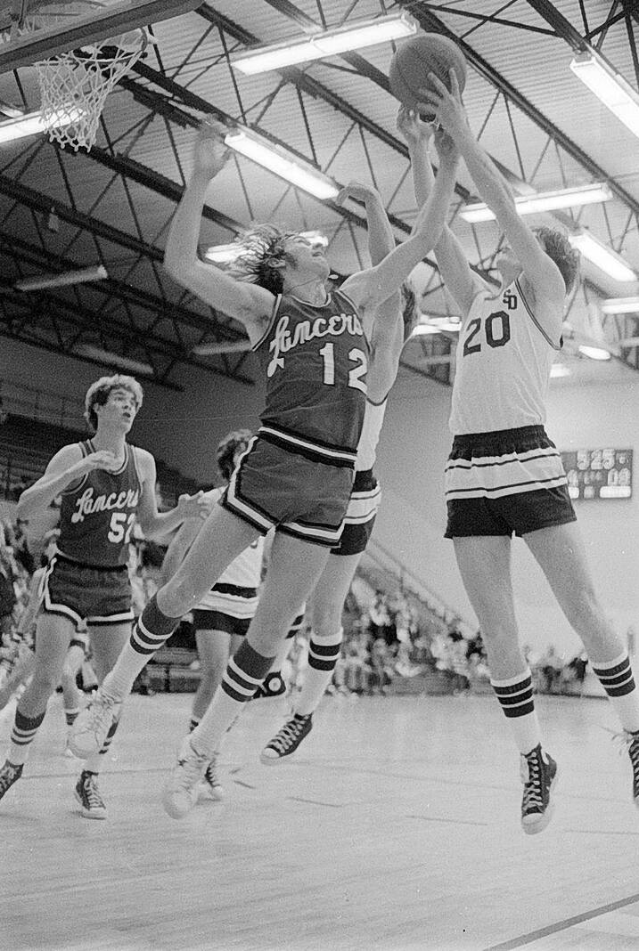Edinburgh’s Bryan Burton (12) and South Decatur’s Mark Campbell (20) vie for a rebound during Dec. 16, 1975’s game near Westport.