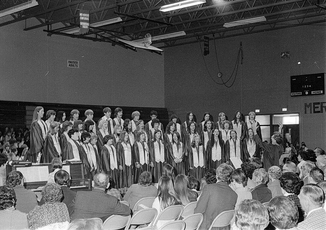 Ruby Walker, right, directs the Hauser High School Choral Show Group during Dec. 15, 1975’s annual Flat Rock-Hawcreek School Corp. Christmas Concert.