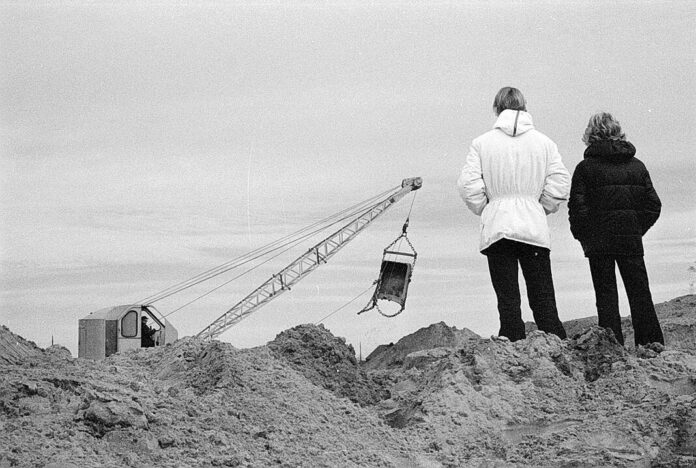 Youngsters watch the excavation for one of three new houses at 31st Street and Taylor Road near a small pond on Dec. 26, 1975.