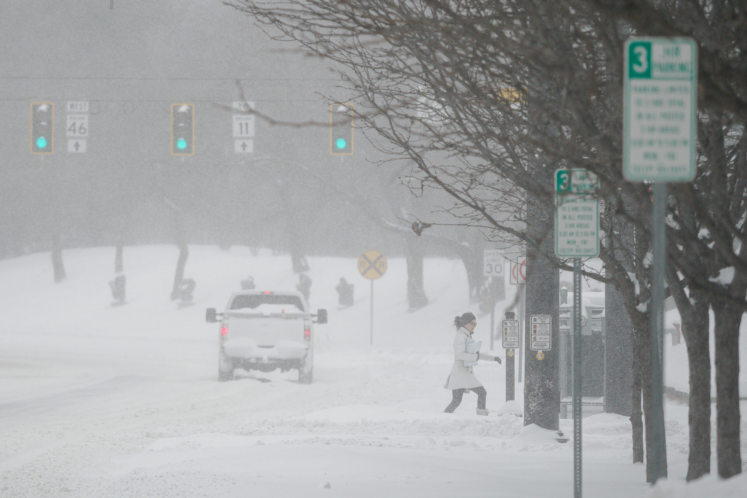 Snow billows in the air as a woman crosses Third Street in downtown Columbus, Ind., Monday, January 6, 2025.