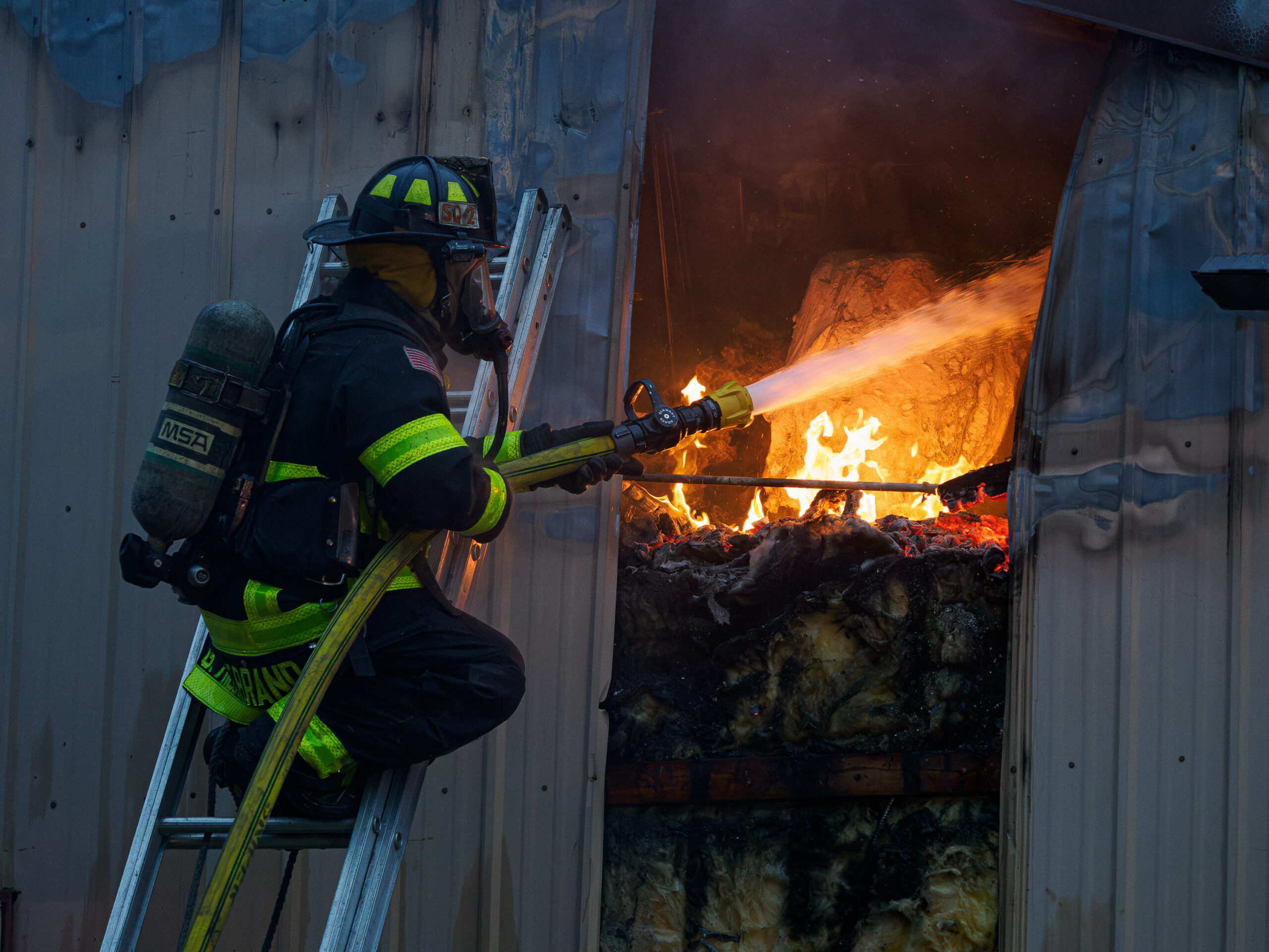 Columbus firefighter George Hilderbrand III works the scene of a warehouse fire on Scott Drive in Columbus, Ind., Thursday, Feb. 14, 2025.