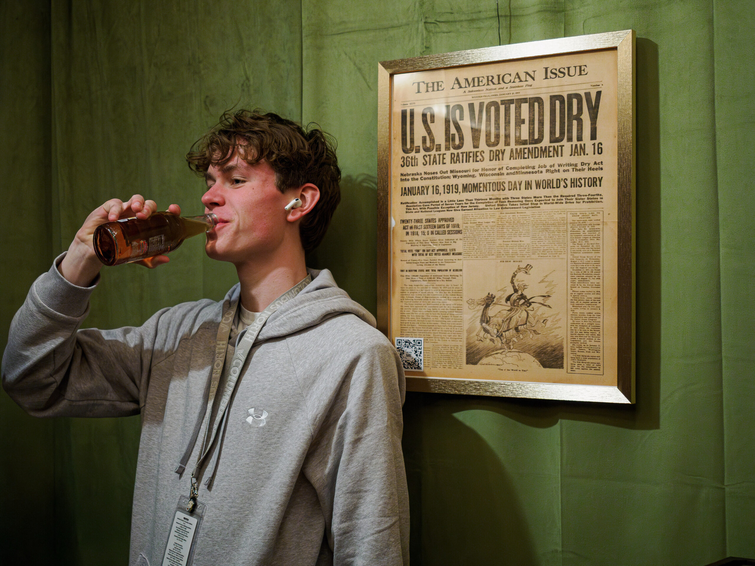 Columbus North student Leyton Hottell drinks a cream soda in a speakeasy at Columbus North High School in Columbus, Ind., Monday, Feb. 17, 2025. Chad Russell, an AP US history and world history teacher, built a speakeasy in the basement of the high school to teach an immersive history lesson on the 1920s and prohibition in the United States.