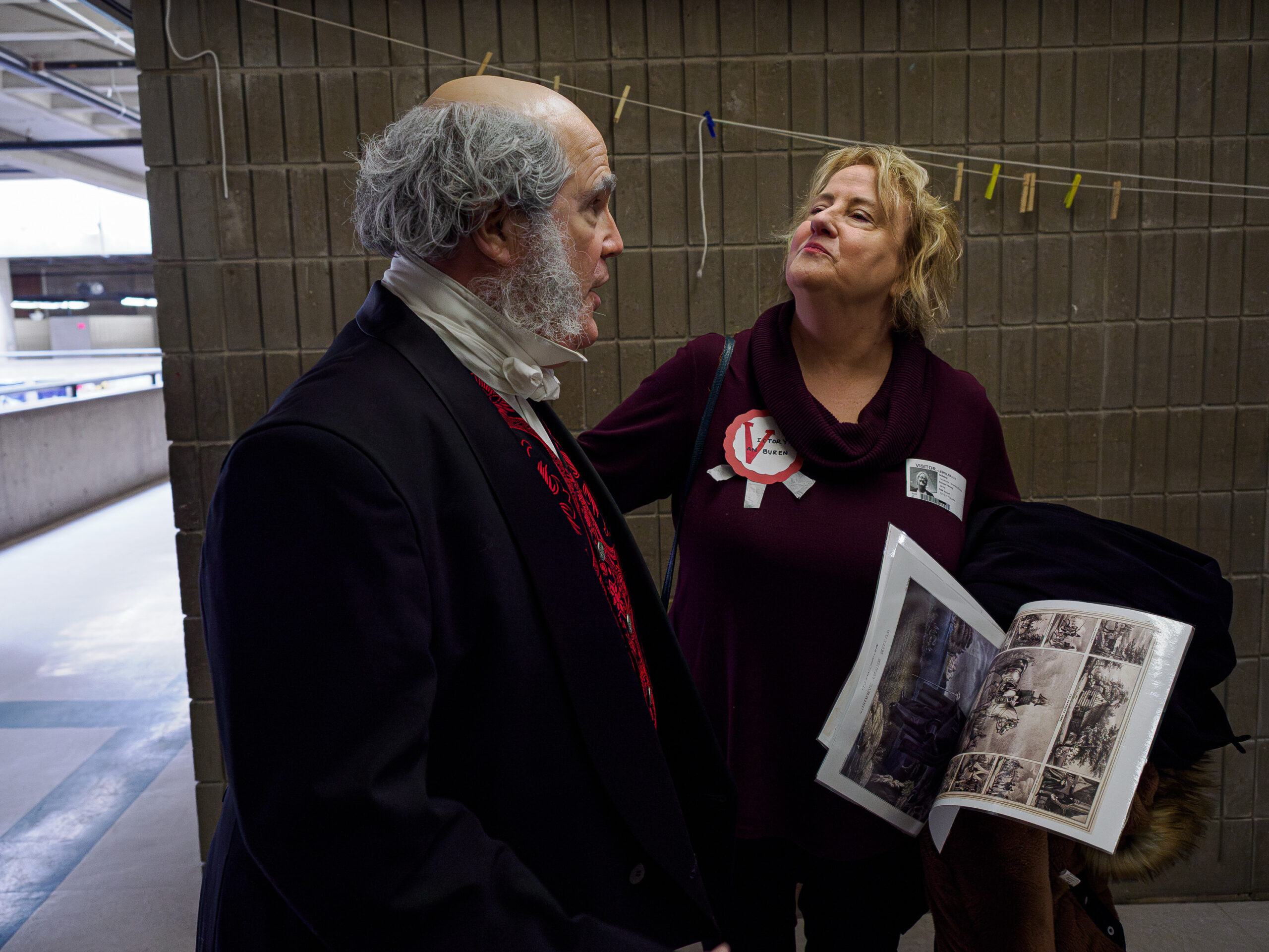 Greg Lewis gets a last minute costume check from his wife Nancy before his presidential portrayal of former US president Martin Van Buren for a group of students in the Southside Academic Challenge program at Southside Elementary School in Columbus, Ind., Tuesday, Feb. 18, 2025. Lewis dressed up as Van Buren to teach an interactive history lesson about the former president to a group of fourth, fifth and sixth graders.