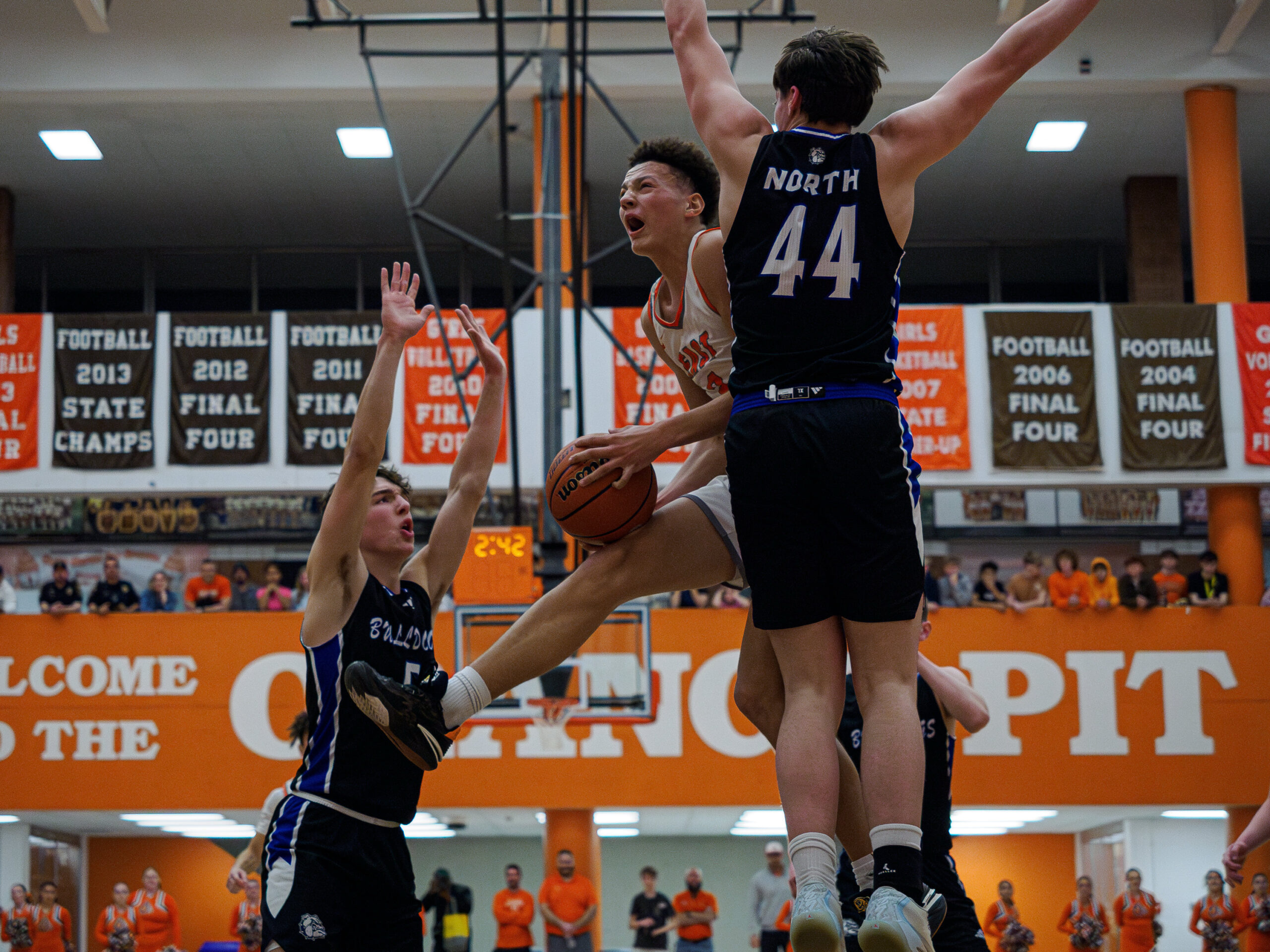Columbus East’s Keaton Lawson, in white, leaps between Columbus North’s Caleb Ferguson, left, and Garrett Long to shoot a layup during an IHSAA sectional basketball game at Columbus East High School in Columbus, Ind., Tuesday, March 4, 2025. East defeated their rivals 64-41 to advance to the next round.