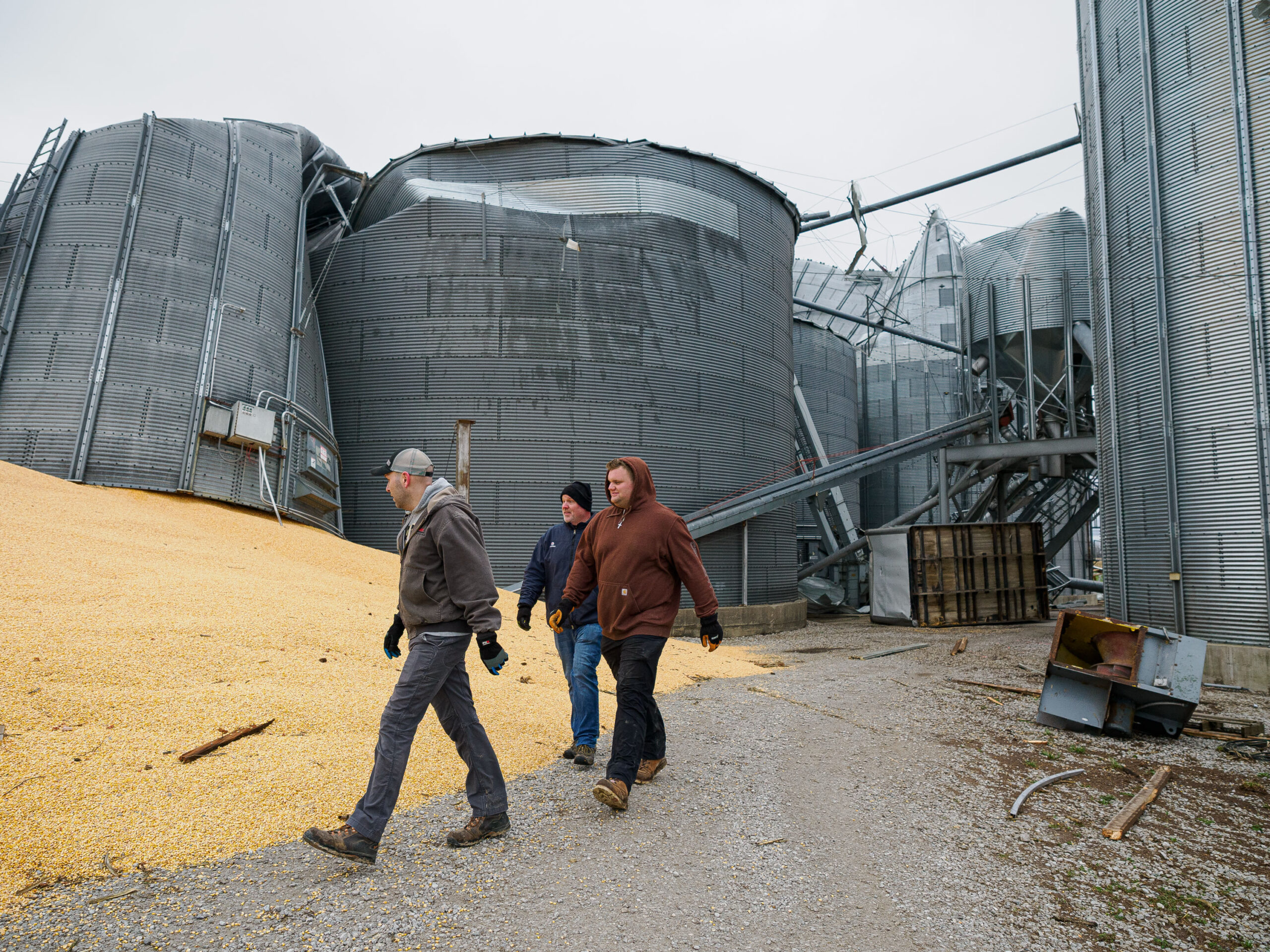 Nathan Schiefer, from left, Drew Schiefer and Nick Cruser survey damaged silos on the Arnholt family farm after a suspected tornado in Columbus, Ind., Thursday, March 20, 2025.