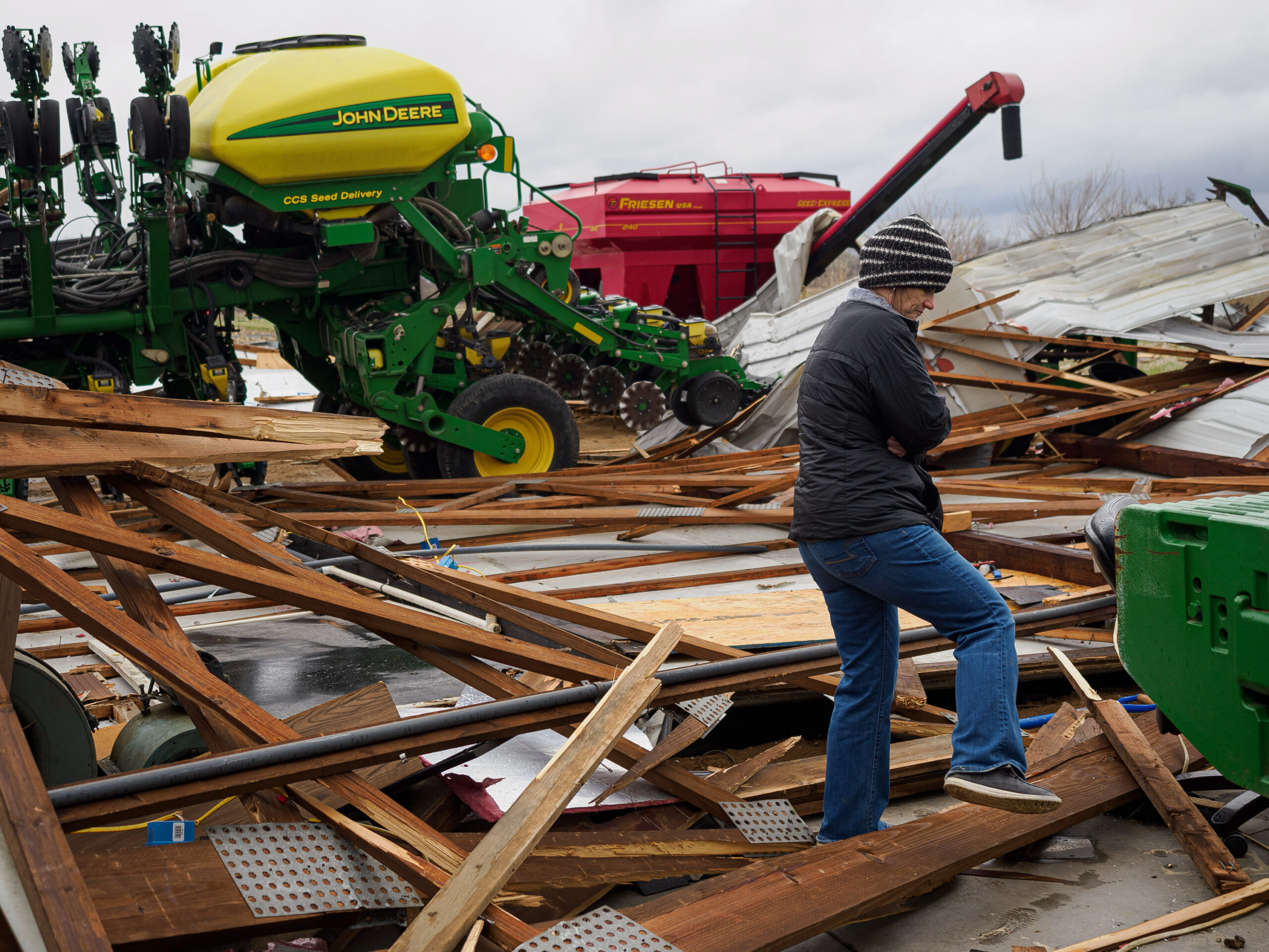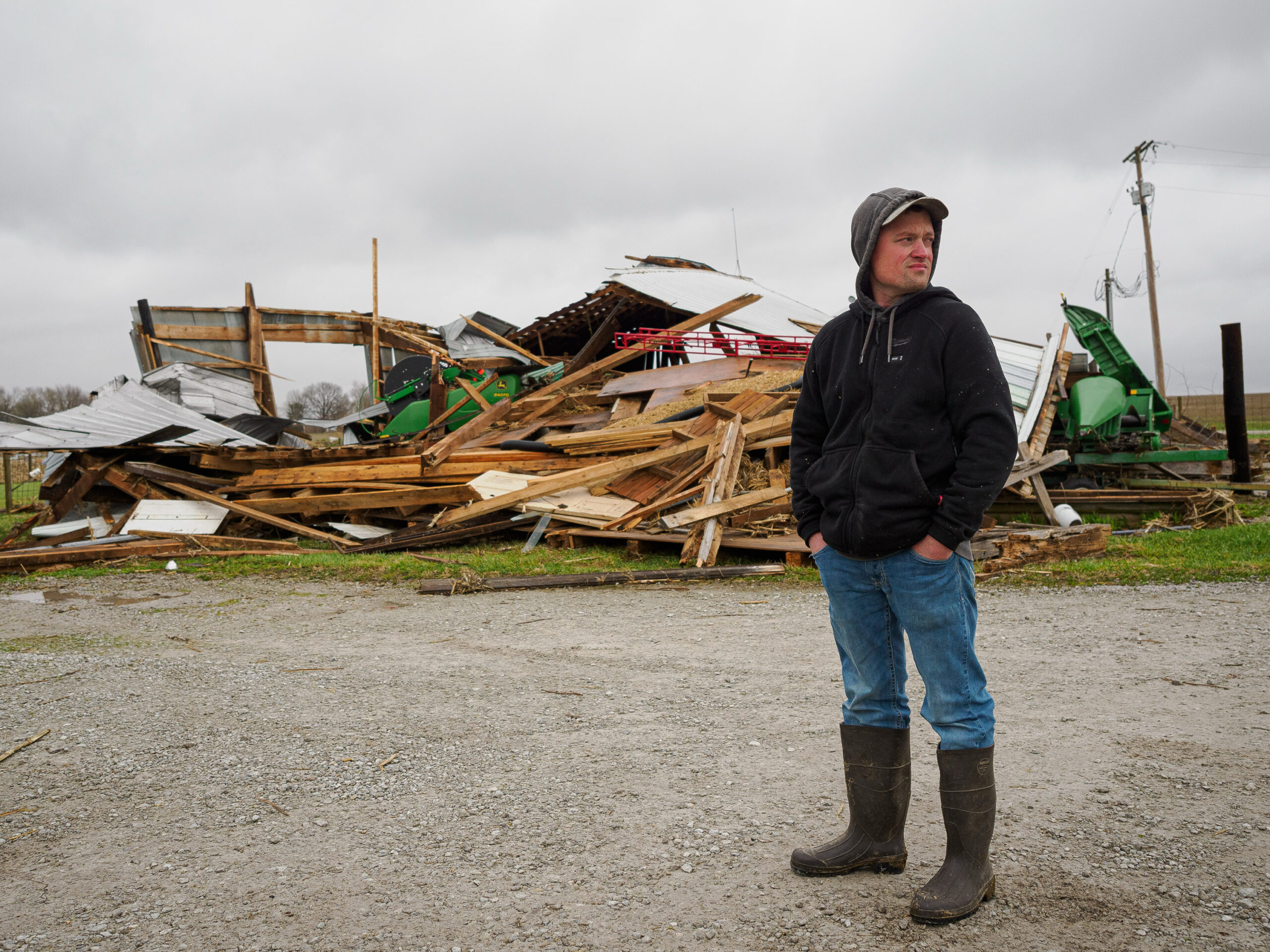 Conner Arnholt surveys damage done to his home and farm by a suspected tornado in Columbus, Ind., Thursday, March 20, 2025. Thunderstorms hit Bartholomew County late Wednesday night and caused damage across the county.