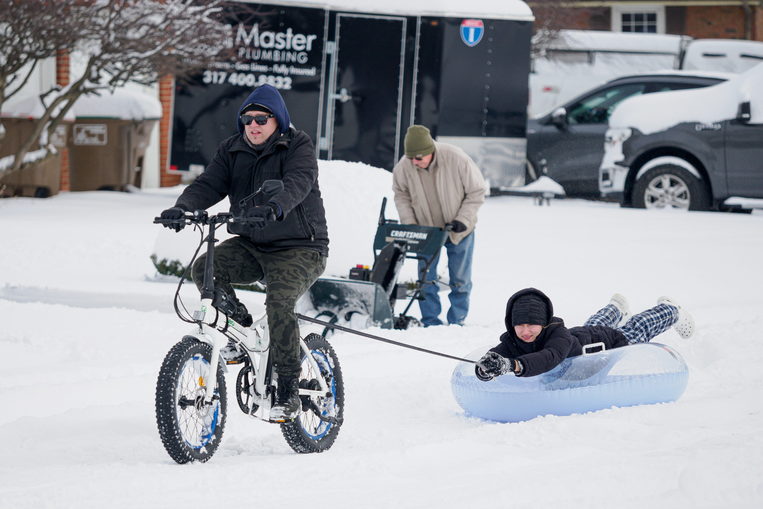 People have fun in the snow on Lantern Lane in Columbus, Ind., Monday, January 6, 2025.