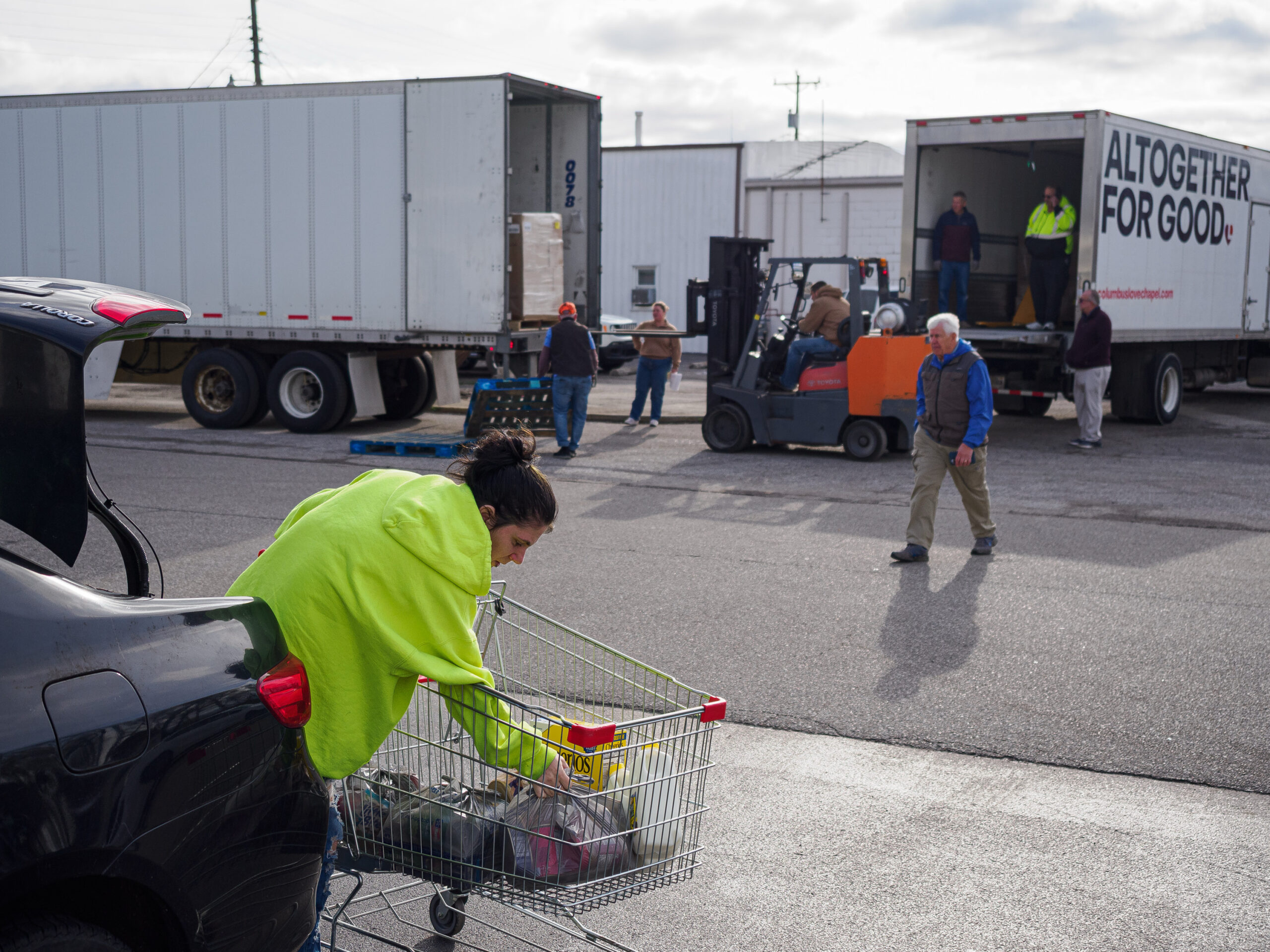 Shianna Golding loads food from the Love Chapel Food Pantry into the trunk of her car as volunteers unload a food delivery to the the food pantry from the Church of Jesus Christ of Latter-day Saints at the Love Chapel Food Pantry in Columbus, Ind., Monday, March 31, 2025.