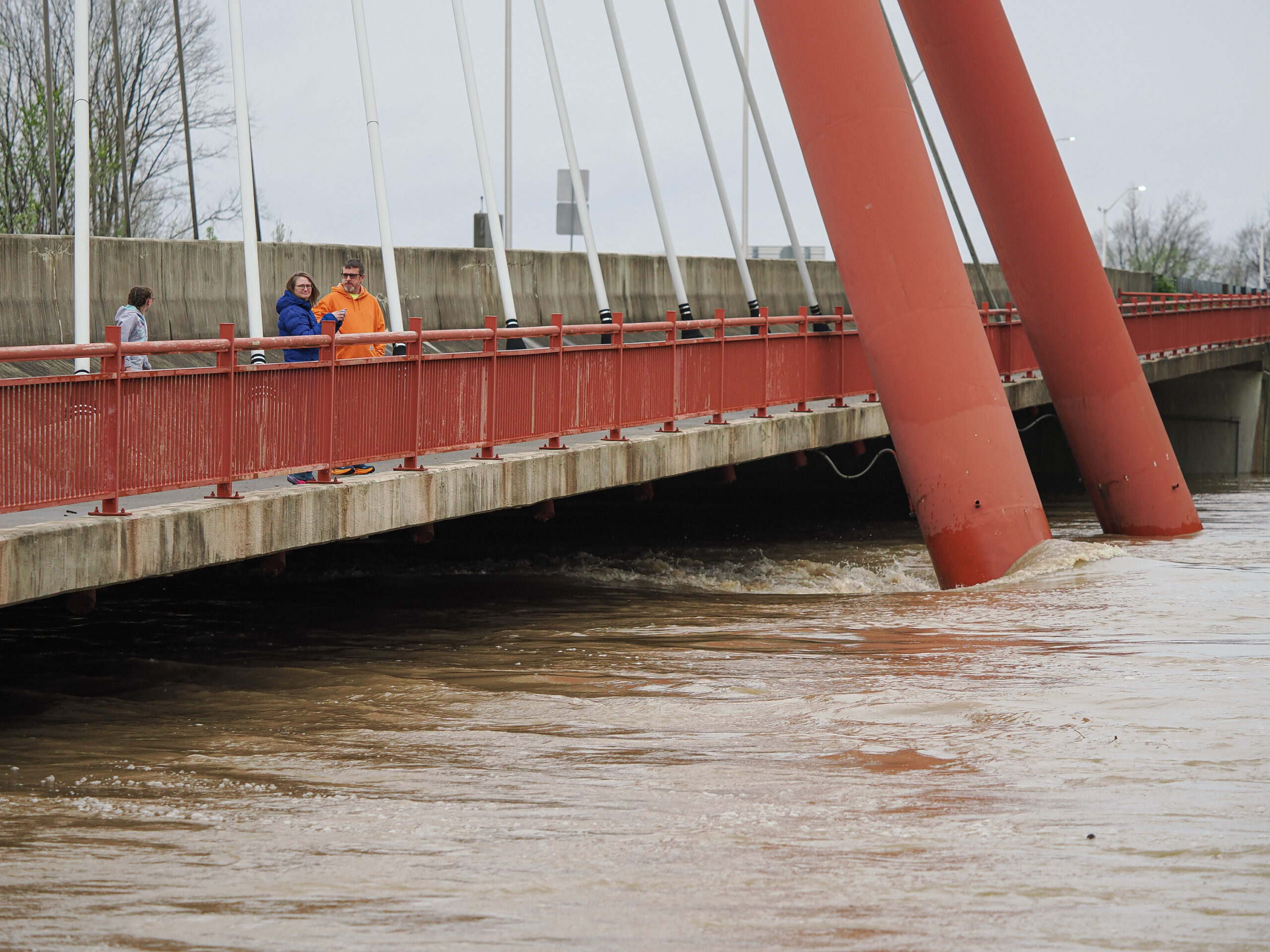 Bystanders get photos of the water level of East Fork White River at the Robert N. Stewart Bridge in Columbus, Ind.,, April 6, 2025.