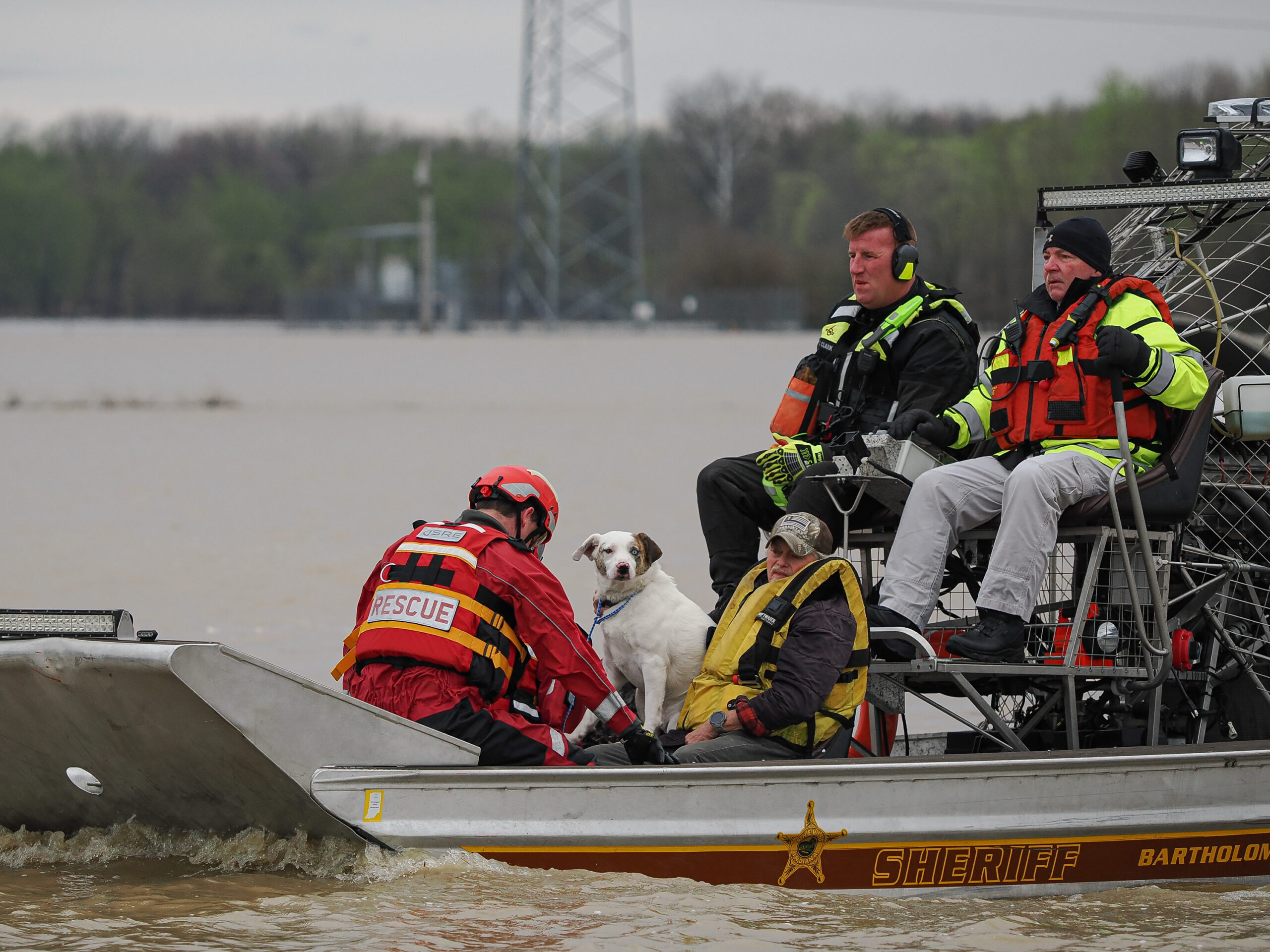 Members of the Bartholomew County Sheriff’s Office and the Columbus Township Fire Department rescue Terry Turner and his dog Ringo from their home off 400 S near Southern Crossing in Columbus, Ind., April 6, 2025. Turner and Ringo had become stranded in their home due to rising flood waters. First responders used an air boat to rescue them.