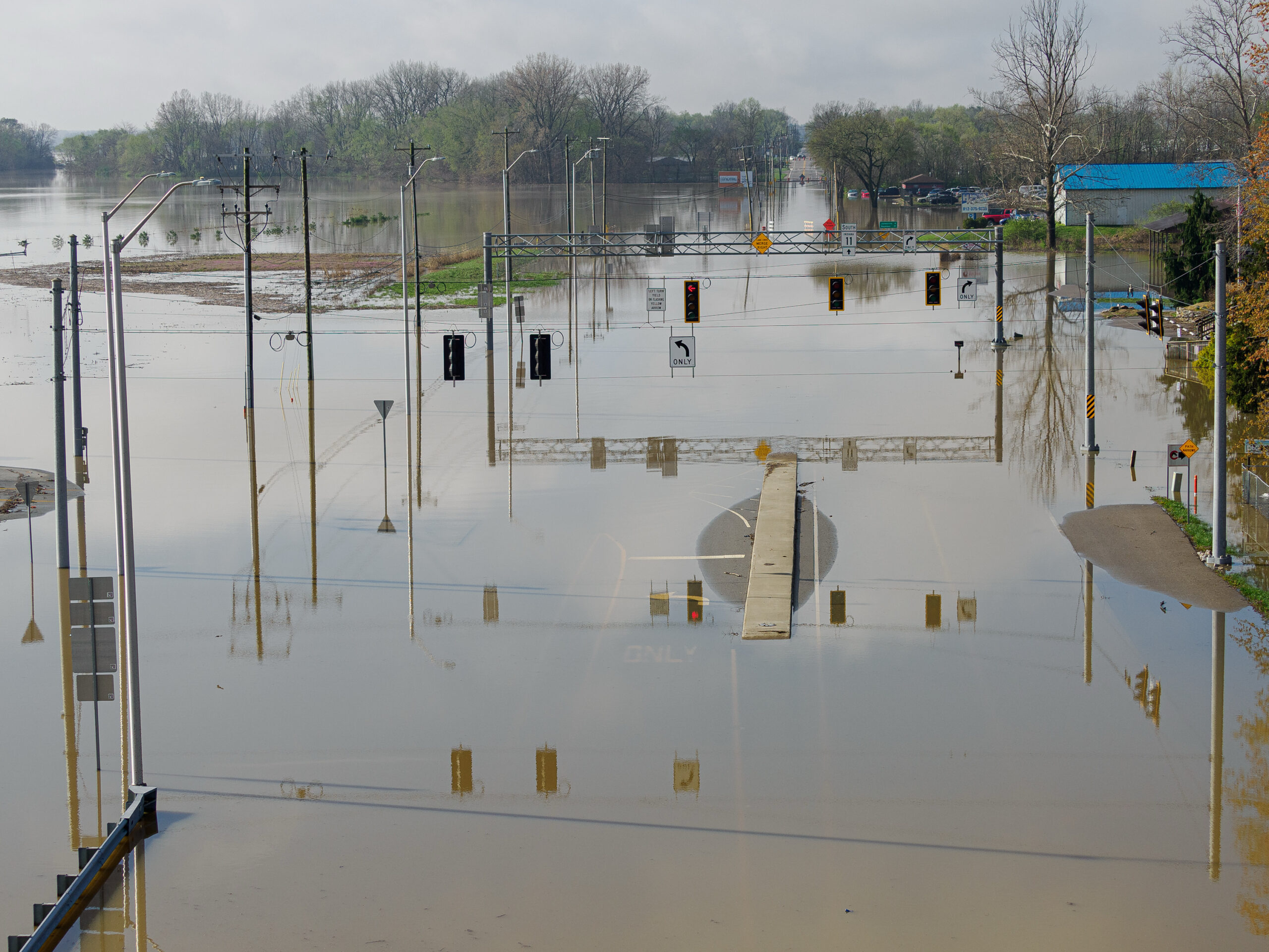 A view of the ongoing flooding of East Fork White River on State Road 11 looking toward Garden City from the State Road 46 and State Road 11 overpass in Columbus, Ind., Monday, April 7, 2025.