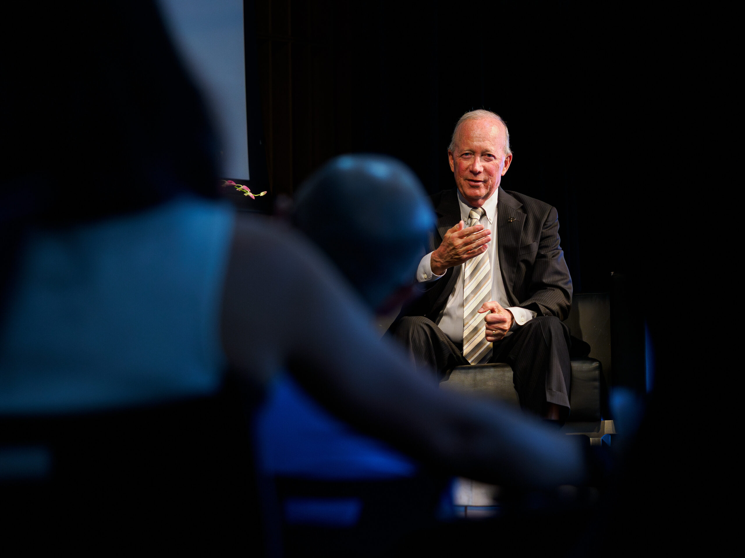 Former Indiana governor Mitch Daniels participates in a fireside chat during the Kirr, Marbach & Company 50th anniversary party at The Commons in Columbus, Ind., Thursday, May 1, 2025.