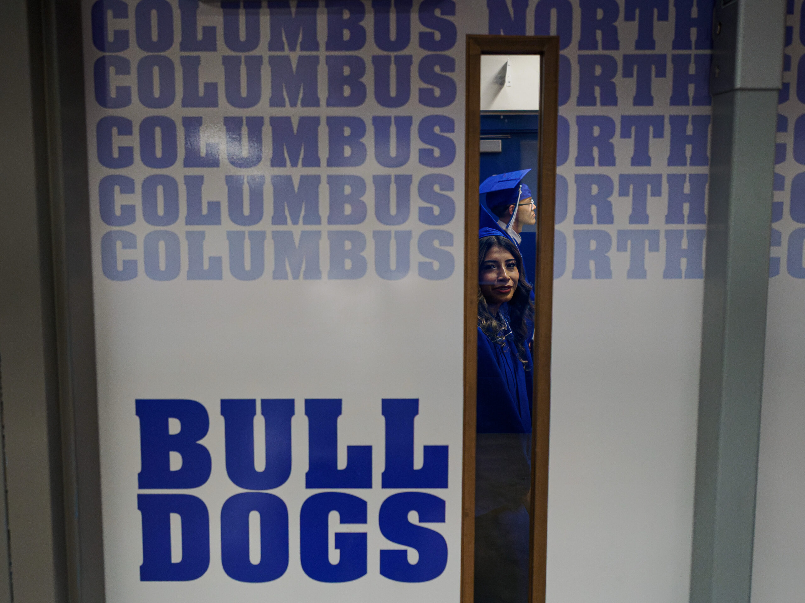 Columbus North senior Jennifer Martinez looks through a window as she wait for the start of her commencement ceremony at Columbus North High School in Columbus, Ind., Saturday, May 24, 2025.