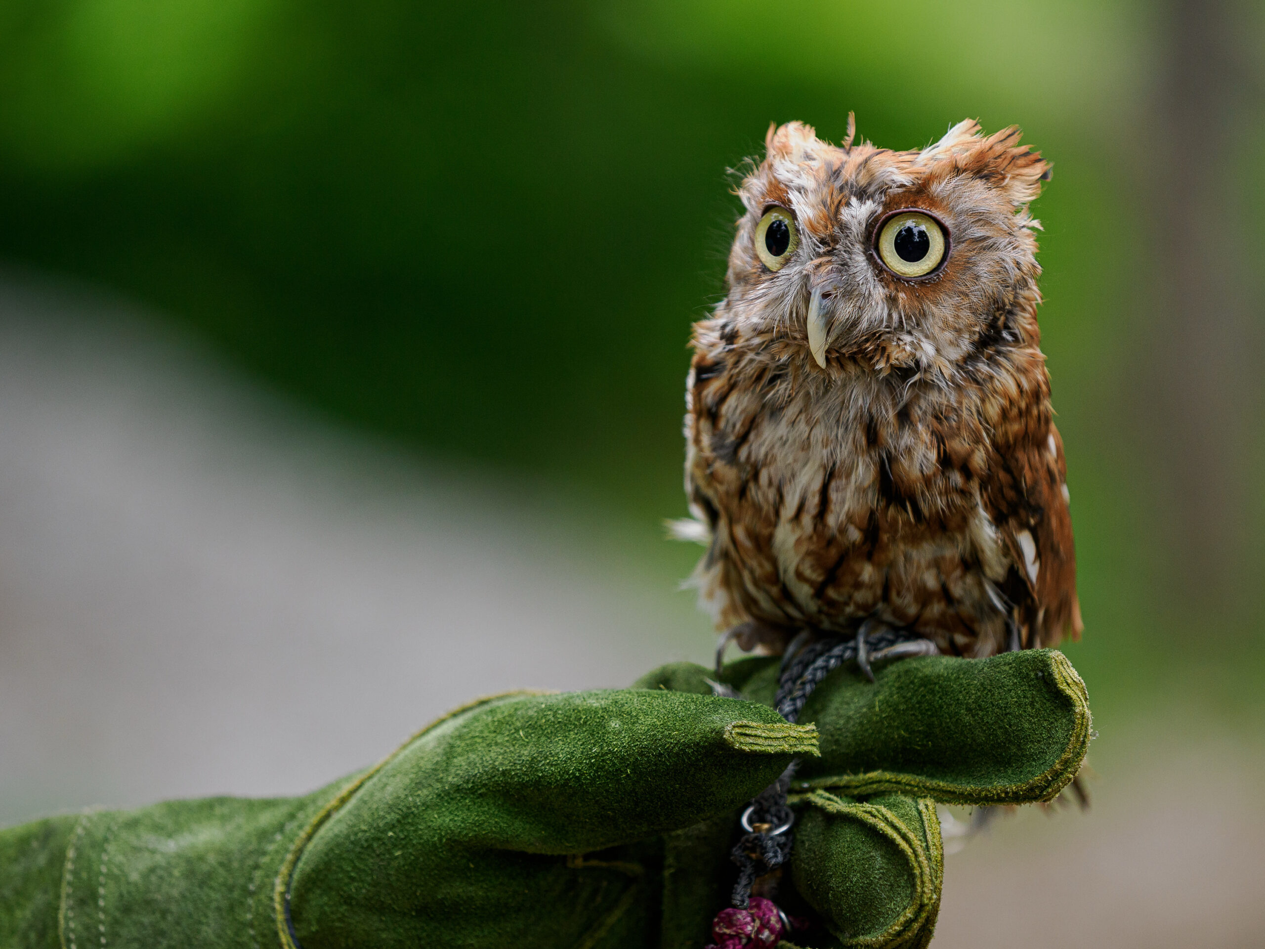 An Eastern screech named Soren is perched on the hand of Utopia Wildlife Rehabilitators volunteer Shawn Tyler as Tyler leads an educational session during tour of Utopia Wildlife Rehabilitators in Hope, Ind., Tuesday, June 17, 2025.