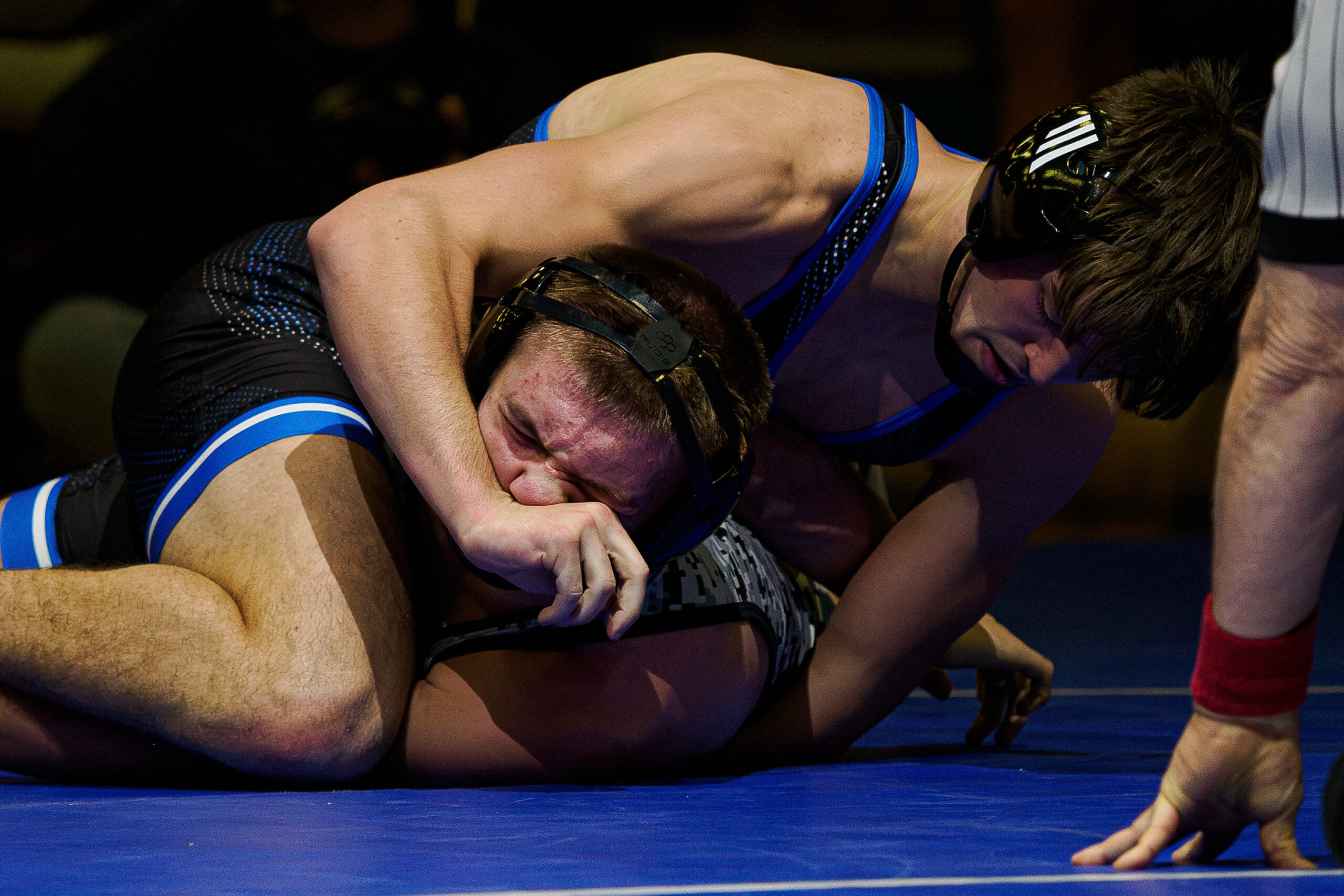 Columbus North’s Asher Ratliff, top, puts a cross face on Jennings County’s Darrell Hicks in a wrestling match between the two schools at Columbus North High School in Columbus, Ind., Tuesday, Jan. 14, 2025.