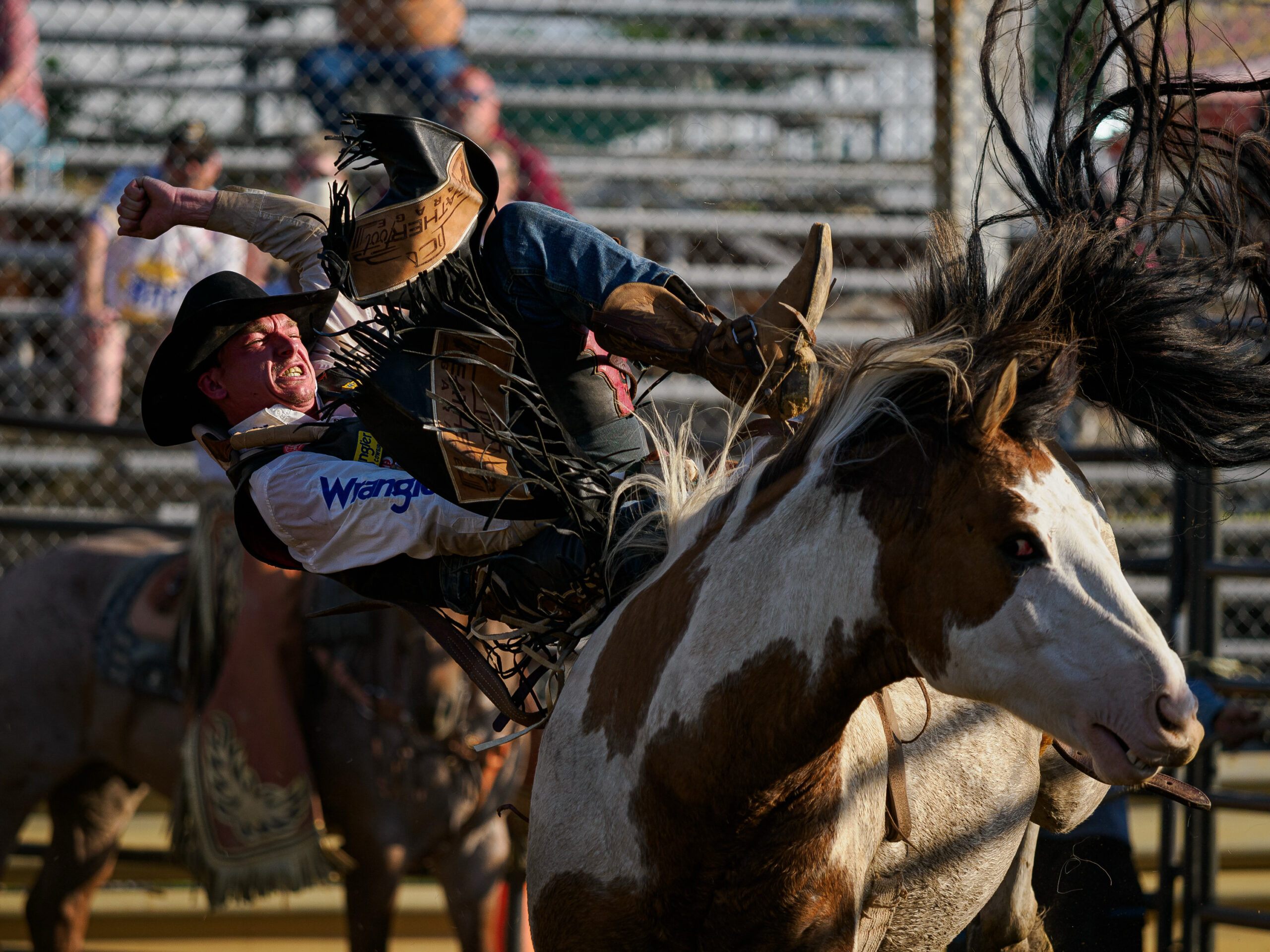 Mark Kreder competes in the bareback riding portion of the Three Bar J Rodeo during the Bartholomew County 4-H Fair at the Bartholomew County 4-H Fairgrounds in Columbus, Ind., Monday, June 23, 2025.