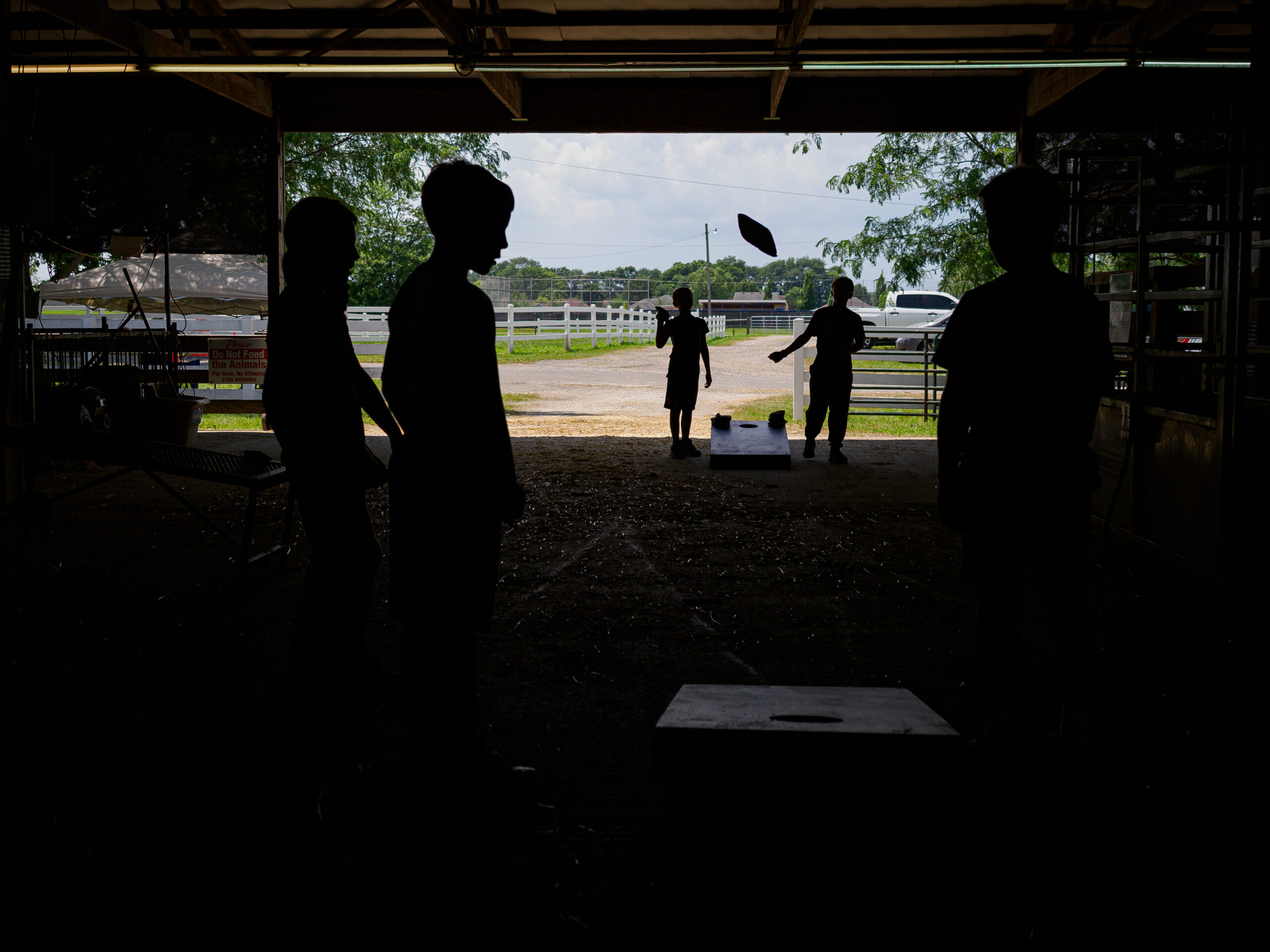 A group of 4-H’ers play cornhole in the barn during the Bartholomew County 4-H Fair at the Bartholomew County 4-H Fairgrounds in Columbus, Ind., Wednesday, June 25, 2025.
