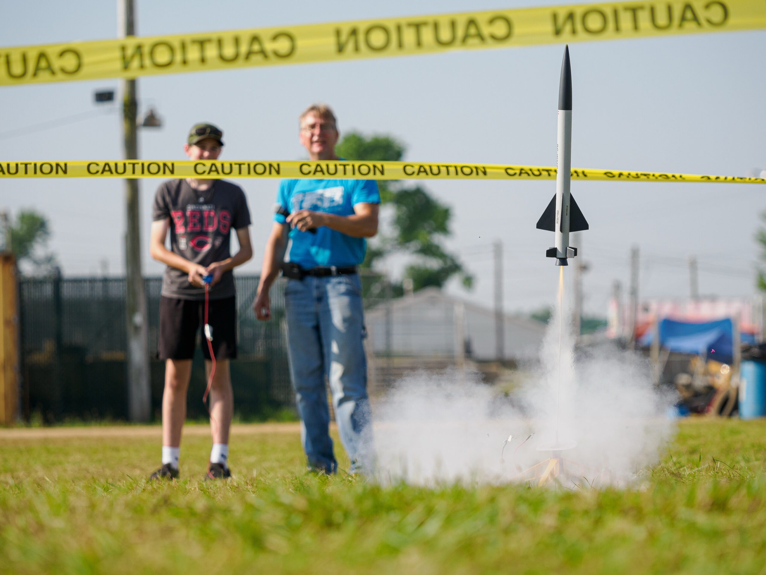 Drew Gatewood, left, and Scott Decker launch Gatewood’s model rocket in the 4-H Rocket Demonstration during the Bartholomew County 4-H Fair at the Bartholomew County 4-h Fairground in Columbus, Ind., Friday, June 27, 2025.