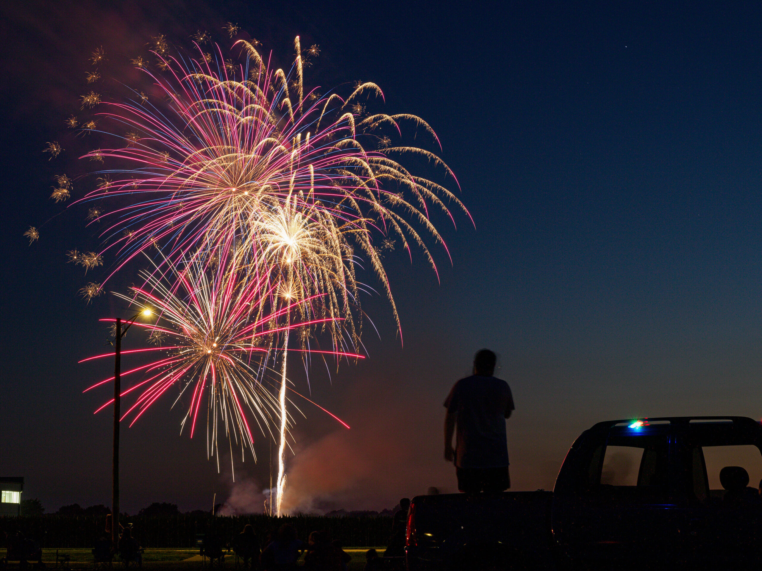 Bailey Carter watches fireworks light up the sky during the the QMIX Musical Fireworks celebration at AirPark Columbus in Columbus, Ind., Thursday, July 3, 2025.