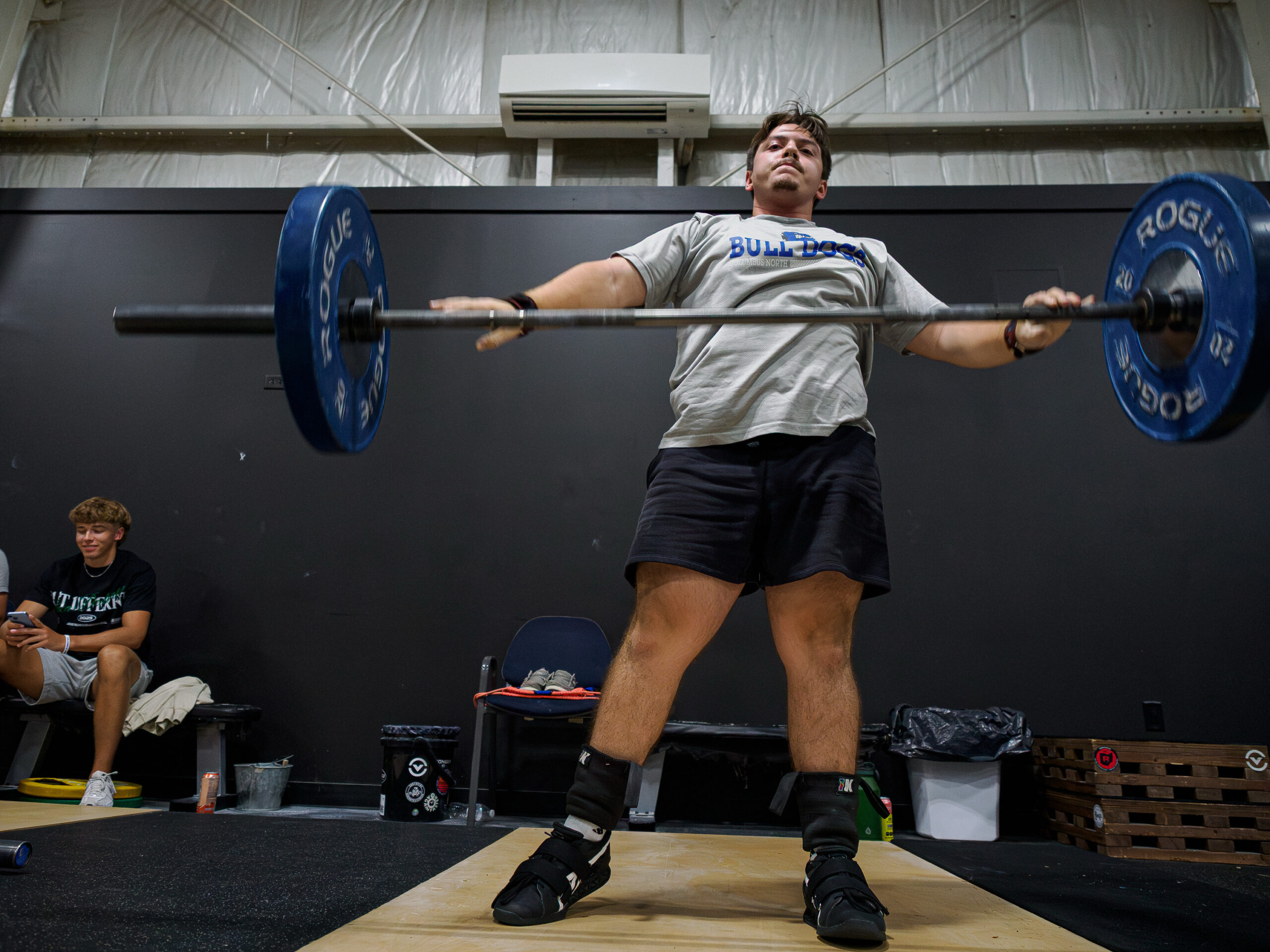 Tito Heredia drops a barbell loaded with weights to the mat during a weightlifting session at Tipton Lakes Athletic Club in Columbus, Ind., Friday, July 11, 2025.